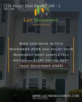 2224 Valley Edge Dr Unit 108 is a 3 bedroom, 2 bathrooms apartment for rent. It is located in Raleigh. It has apartment amenities including dishwasher, in-unit laundry, walk-in closets, ceiling fan, hardwood floor, carpet, air conditioning, and microwave. Cats and dogs are allowed, making it a pet-friendly apartment.