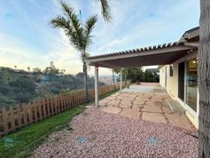 The backyard is a true highlight, featuring sweeping canyon views framed by mature palm trees and a covered patio area—perfect for outdoor dining, entertaining, or simply unwinding after a busy day. The enclosed private front yard provides a secure space for children or pets to play. Inside, the home offers comfortable living spaces designed for daily family life.