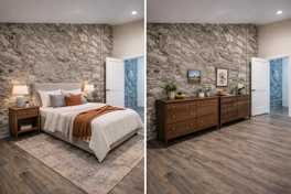 This renovated unit features quartz countertops, stainless steel appliances, and a newer Bosch washer & dryer. The layout has a unique loft feel with exposed stone accents and modern finishes.