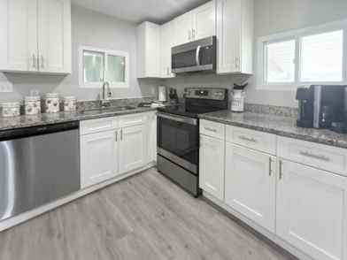 The kitchen comes equipped with new stainless steel appliances, including a fridge, range, microwave and dishwasher. Granite countertops!!! White shaker cabinets, stainless steel sink and fixtures. New vanity, toilet, tub, tile surround and fixtures in the bathroom.