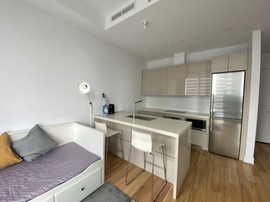This gorgeous FULLY FURNISHED unit is on the 36th floor on the project, 690 sqf, south-facing, 9 ft ceiling + glass walls, super bright even in cloudy days, high-end interior finishing and private balcony with splendid views of Saint Lawrence River and Place Ville-Marie. Perfect for the professionals or young couples who are looking for luxury and convenience.