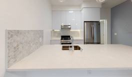 -Gorgeous kitchen with waterfall island, quartz counter tops, and white glossy cabinets