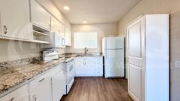 Available Now! Charming and well-maintained 2-bedroom, 1-bath home in the heart of Sun City. Offering a functional and inviting layout, this property blends comfort with thoughtful updates throughout. The open-concept great room design seamlessly connects the kitchen and living areas. Large windows and sliding glass doors bring in abundant natural light. The updated kitchen features white cabinetry, granite countertops, and matching appliances. Sleek wood-look flooring runs throughout, with tile in all the right places. Both bedrooms are nicely sized. Louvered closet doors and textured walls add character, while the full bathroom includes a granite vanity and a glass-enclosed shower for a modern touch. Enjoy a fenced backyard with a covered patio — perfect for relaxing or entertaining. The home also includes a convenient carport. Located in a desirable Sun City neighborhood with nearby parks, dining, and entertainment, this home offers both comfort and convenience. 55+ community