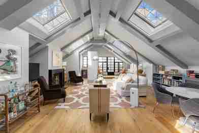 Recently featured in House Beautiful, this one-bedroom, two-bath apartment has the feeling of a free-standing home in the heart of the city. Arrive via keyed elevator to your private foyer flanked by a large storage closet and outdoor terrace entry. A wall of industrial windows opens to the astonishing 650-square-foot great room. Here, six massive skylights dot the cathedral ceiling 12-feet tall at its peak providing a breathtaking sense of air and light. The current owner gut renovated the space with a meticulous eye to every detail, including molding, repositioning the fireplace and adding double doors to the spacious bedroom to allow a free flow of light throughout. The two full bathrooms an en suite with walk-in shower and a guest bath with a deep soaking tub embrace modern fixtures and timeless details in both tilework and black-and-white color scheme. The beautiful windowed kitchen is outfitted with top-of-the-line stainless steel appliances, a farm sink, and ample counter and storage space.