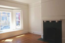 Living room with a working fireplace. Bay windows with a window seat.