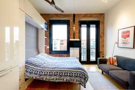 The unit boasts 11ft ceilings. Details include exposed brick, hardwood floors, and clean/modern lines. Oversized window and floor-to-ceiling Juliet patio provide lovely natural light and airflow. The unit is equipped with modern appliances, full kitchen and dishwasher; dining table and wall bed; television; in suite washer and dryer; large glass shower. There is ample storage! This efficient 300 sq ft space is great for students, professionals, and business travellers. Live downtown, work from home, or walk to your office.