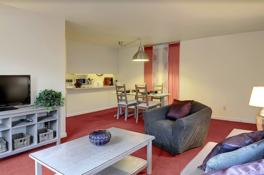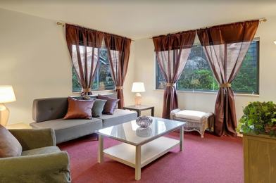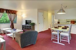 Top floor, end unit perched up high near the top of the hill, giving this spacious one bedroom apartment a sense of maximum privacy and quiet as you look over the tops of lush green trees. Pleasing combination of burgundy and gray throughout is interesting yet soft and livable. South facing windows let in lots of light and bright. Living room is great for watching expanded cable TV or movies from the flat screen. Dining room has a glass top table that sits 4 very comfortably. Kitchen is well stocked so that you can do some creative cooking at home. Bedroom has a queen sized bed and plenty of linens provided. Desk space is generous for your laptop and projects, Wi-Fi and hardwired internet is set up prior to your arrival. One designated parking space rounds out the essentials for a carefree and comfortable lifestyle.