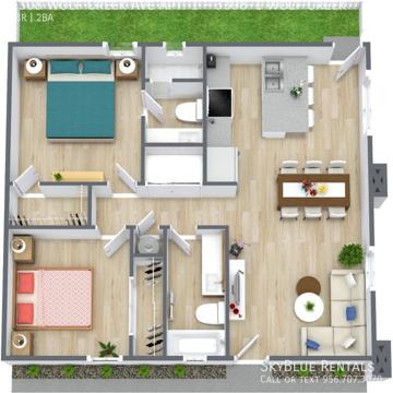 A must see unit with an open layout, modern flooring, Granite Countertops, modern lighting fixtures including recessed lighting throughout the unit, modern sleek two-toned cabinets. Vaulted ceilings with a fan in Living room and bedrooms. All bedrooms come with double chrome closet rods, master bathroom has a glass walk-in shower and custom built-in drawers.