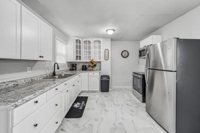 The kitchen comes equipped with a fridge, sink, oven, stovetop, as well as basic cookware.