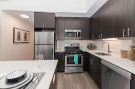 Apartments here are bathed in natural light thanks to the floor-to-ceiling windows, perfectly complemented by the tall, exposed concrete ceilings. Thoughtfully designed kitchens are equipped with European-style cabinetry, quartz countertops, and stainless steel appliances. The bathrooms with their Grohe fixtures and spacious vanities with frameless mirrors are both stylish and functional. You’ll also enjoy comfort and convenience with a Wi-Fi Smart Thermostat and in-unit washer and dryer.