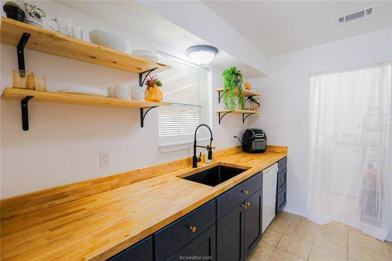 This charming duplex in College Station offers a thoughtfully designed blend of comfort, function, and convenience across approximately 992 square feet of living space. Featuring two bedrooms and one bathroom, the home is finished with durable tile flooring throughout, providing a clean and cohesive feel from room to room. The kitchen is highlighted by warm butcher block countertops that add character while maintaining everyday practicality, and a washer and dryer are included to simplify daily routines.