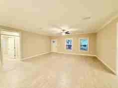 The spacious bedrooms offer comfort with plush carpeting and ceiling fans. The primary suite boasts a beautiful tray ceiling and an ensuite bath with dual vanities, large framed mirrors, a large walk-in closet, and a huge walk-in shower with seating. The two additional bedrooms share a second full bath with single vanity and tub/shower combo.