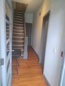 Step inside to find a bright, open-concept living space with gleaming hardwood floors, large windows that flood the room with natural light, and thoughtful modern finishes throughout. The kitchen features stainless steel appliances, ample cabinet space, and a breakfast bar – ideal for casual dining or entertaining.