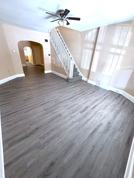 This two-story property in Philadelphia offers 190 sq. ft. of living space, efficiently distributed across its floors. The ground level, measuring 510 sq. ft., showcases a spacious living area with sleek vinyl flooring and a modern ceiling fan. An arched doorway leads to additional rooms, adding architectural interest. The kitchen boasts oak cabinetry, granite countertops, and a tiled backsplash, complemented by white appliances and ample natural light from a large window.
