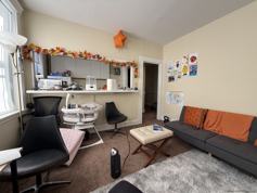 The apartment features, a living room, one bedroom, separate galley kitchen, and am older style bathroom.