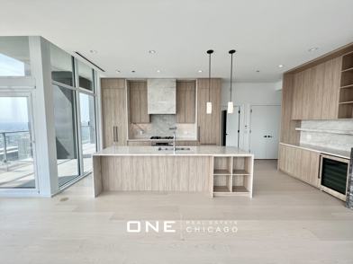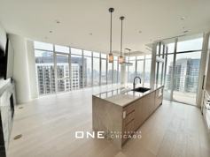 Private balconies and floor-to-ceiling windows framing iconic River North views.
