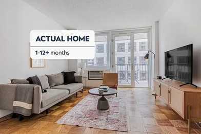 W 55th St #14B, New York, NY is a 2 bedroom, 2 bathrooms apartment for rent. It is located in the Theater District neighborhood of New York. It has apartment amenities including dishwasher, air conditioning, deck, in-unit laundry, on-site laundry, balcony, and furnished. Cats and dogs are allowed, making it a pet-friendly apartment.