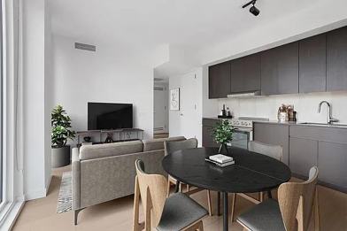 This apartment offers an exceptional living experience, highlighted by its striking high ceilings, which create a sense of vastness and freedom. The extra vertical space adds an architectural elegance, transforming the room into a light-filled haven that feels both expansive and serene. Designed for those who appreciate refined living, the modern kitchen seamlessly blends into the open layout, providing a functional and stylish setting for any occasion. Every detail, from the quality finishes to the well-considered flow of the space, enhances the apartment's contemporary appeal. Conveniently located in a lively neighborhood, this residence allows you to enjoy the perks of urban living while retreating to the calm and tranquility of your beautifully crafted home. Its an ideal place for those who seek both style and comfort in a thoughtfully designed space.