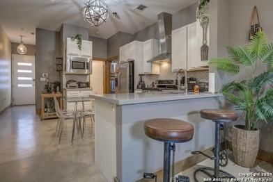 Live at the center of it all in this stylish and modern condo just blocks from the historic Pearl Brewery and minutes from Downtown San Antonio. This beautifully designed unit offers urban living at its finest with soaring 10' ceilings, stained concrete floors, sleek quartz countertops, and an open-concept layout that flows seamlessly to a large private deck-perfect for morning coffee or evening city views. Inside, you'll find two spacious bedrooms with walk-in closets and a luxurious tile walk-in shower in the primary suite. The gated community offers peace of mind with two covered parking spaces, a sparkling swimming pool, a grilling area. The unit also includes a new water heater, refrigerator, washer, and dryer-everything you need to move right in. From trendy restaurants and boutique shopping to cultural spots and nightlife, you'll enjoy unmatched walkability to the Pearl, the River Walk, and easy access to major highways. If you're looking for comfort, convenience, and contemporary style in one of San Antonio's most vibrant areas, this condo is a rare opportunity to enjoy the best of city living-schedule your showing today and experience it for yourself.