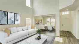 The open floor plan is filled with natural light. The kitchen includes highly desirable stainless steel appliances, granite counters, a gas stove, and white farm-style cabinets.