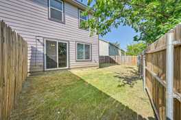 Step into a bright foyer with soaring ceilings and a stylish staircase. The open-concept kitchen, dining, and living area features granite counters, shaker slow-close cabinets, stainless appliances (fridge, stove, microwave hood, dishwasher), and sliding doors that lead to a private fenced yard.