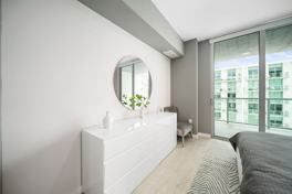 This brand-new apartment features a minimalist interior design and modern furniture. The bright living room opens to a balcony with city views. The main bedroom has a queen-size bed and a walk-in closet with its own entrance to the balcony. The cozy secondary room has twin beds and a workspace. There are two bathrooms, one with a neat glass shower and the other with a relaxing bathtub. Enjoy the comfortable dining room and spacious kitchen with an island and new home appliances.