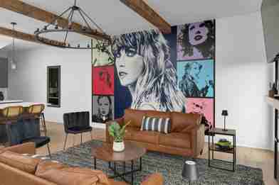 The home is beautifully curated with unique artwork, décor, and memorabilia inspired by Taylor’s musical journey. Each of the three bedrooms represents a different era—RED, FOLKLORE, and LOVER—offering a fun, immersive experience while still maintaining a polished and tasteful design throughout the space. The fully stocked chef's kitchen features a double‑door refrigerator, stainless steel oven and stove, microwave, built-in dishwasher, and island counter seating. The cozy living room has warm leather sofas, a sleek fireplace, a bold mural, and sunlit windows. A starter supply of all paper goods and household necessities is provided, including bath tissue, paper towels, trash bags, dish soap, hand soap, shower gel, laundry detergent, shampoo and conditioner, body soap, and clothing storage.