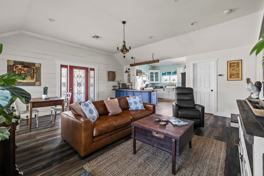 The cottage features elegant farmhouse décor, handpicked antiques, and cozy, luxurious touches. The living area invites relaxation with its comfortable leather furnishings and warm ambiance, holding special antiques found in Texas Hill Country. Prepare delicious meals in the fully equipped kitchen with cafe station, complete with modern amenities. A dining area provides an intimate setting for meals.