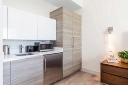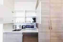 This brand-new apartment features a king-size bed and is fully furnished with ceramic floors, electronic door locks, European-style cabinetry, and modern-style designer fixtures and faucets. The studio offers a stainless steel refrigerator, microwave, dishes, coffee maker, toaster, hairdryer, iron, ironing board, and TVs.