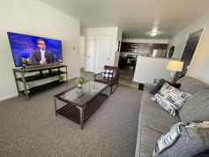 As you step inside, you'll be greeted by a contemporary ambiance with tasteful designer furnishings and modern décor. The open layout seamlessly connects the living, dining, and kitchen areas, creating a spacious and inviting atmosphere. Relax on the plush sofa in the living room while enjoying your favorite shows on the large flat-screen TV, or gather around the dining table for a memorable meal. The kitchen is a chef's dream, featuring sleek stainless steel appliances, including a refrigerator, stove, oven, and microwave. Whip up delicious meals with ease and make use of the ample counter space and high-quality cookware. A coffee maker and toaster are also provided for your convenience.