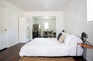 The studio features a kitchenette, dining area, desk for work or leisure, and a wardrobe for your belongings. The house features a fully equipped kitchen, a spacious living area with high-speed Wi-Fi (327 Mbps), a smart TV, on-site laundry, and dedicated workspaces. Guests can also unwind in the large backyard under oak trees, complete with a deck and fire pit. Plush linens, towels, soap, and shampoo are provided.