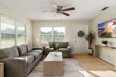 If you're seeking proximity to Tampa without the accompanying traffic, this modern and charming 2-bedroom duplex-style home in Zephyrhills is an ideal choice. The home features a queen bed and two twin beds, with the master bedroom offering an en-suite bathroom with a shower, while the second bathroom is conveniently located off the main living room. The fully equipped kitchen, high-speed Wi-Fi, and large smart TV ensure you feel at home. For larger groups, the home can be booked with the other side of the duplex to create a 4-bedroom, 4-bathroom space.