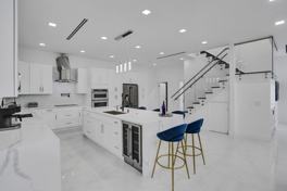 With lots of natural sunlight throughout, this home boasts an expansive open living room, an elegant dining area with a built-in wet bar and a table that seats 12, and gorgeous glass bannisters leading upstairs. Custom zebra shades, new Italian porcelain flooring, Wi-Fi and TVs in every room, and modern furniture with lavish décor enhance the luxurious feel. The beautifully remodeled chef's kitchen is perfect for entertaining, featuring two sinks, stainless steel appliances, including an induction cooktop, wall oven/microwave, hood range, refrigerator, and dishwasher. Custom cabinetry and an island with seating for 6, draped in gorgeous marble countertops, make it fully equipped for all your needs. Enjoy the fully fenced private backyard, which features a custom-made pergola, fish pond, ping pong, and foosball table, ensuring a perfect luxury vacation experience.