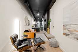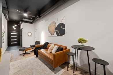 This residence offers a harmonious fusion of modern aesthetics and a warm, welcoming design. It boasts two beautifully appointed bathrooms, a fully equipped kitchen with top-notch appliances, and a stylish dining area. The living room features plush seating for relaxation.
