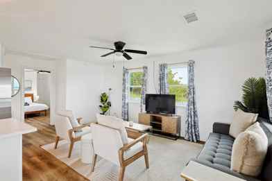 Impeccably decorated to make every room inviting and relaxing, this amazing country home retreat offers style and warmth from top to bottom. The fully equipped kitchen is designed to allow your culinary dreams to soar with stainless steel appliances, cooking essentials, and a kitchen island with natural lighting. The dining area adjacent to the kitchen provides a cozy environment for socializing, while the elegant living room offers a comfortable space to relax with a large flat-screen TV and high-speed Wi-Fi.
