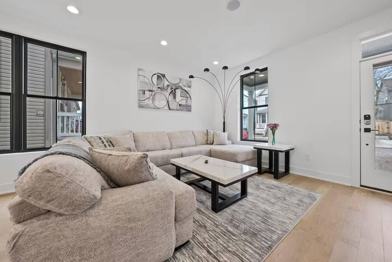 This apartment features upscale decor, huge windows, and a bright white interior. The first floor includes a full kitchen with quartz countertops and premium appliances. A bonus kitchenette on the second floor features a handy sink and a mini-fridge. You can also enjoy a private, covered terrace outfitted with a Smart TV.