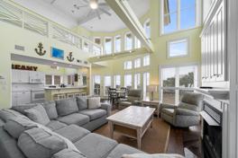 Designed for relaxation and entertainment, Calypso Breeze boasts a generous deck and patio area and outdoor furniture, ideal for alfresco dining or simply soaking up the coastal ambiance. The heated outdoor pool provides a comfort spot for a refreshing dip, while additional community amenities include a tennis court for active guests. Inside, the home combines comfort with style, featuring a cozy fireplace, elegant dining area, and a fully equipped kitchen with modern appliances.