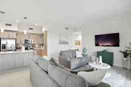 This beautifully designed condo features high-end finishes, furnishings, and chandeliers. With all bedrooms on one side of the unit and living areas on the other, you can enjoy both privacy and space to gather. Built in 2023, this property has never been lived in and is set up primarily for rental guests. The primary suite includes a king bed, large walk-in closet, and a spa-like en-suite bathroom with a glass-enclosed shower, dual sinks, and a wide vanity. Bedrooms 2 and 3 each have a queen-size bed, with Bedroom 3 also offering a home office set-up. The living room is equipped with a sofa, loveseat, coffee table, and large flat-screen TV, while the kitchen boasts a waterfall-edge center island, stainless steel appliances, and sleek European-style cabinetry. A full-size laundry room is conveniently located near the front entry.
