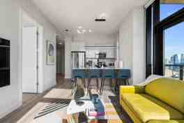 The apartment features city views and spacious living areas, accommodating up to 20 guests with 8 queen beds and 4 rollaway beds, along with 8 baths. Enjoy Sonos sound systems, Smart TVs, and access to a 24/7 fully equipped fitness center in the building. Located just 5 minutes from Little Italy and Union Park, this apartment ensures a comfortable and convenient stay.