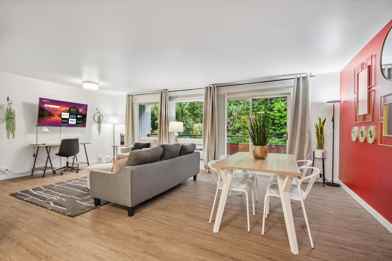 Designed for your comfort and convenience, this apartment offers high-speed Wi-Fi, a fully equipped kitchen, in-unit washer/dryer, a 55" 4K Roku TV, and a chaise lounge. The bedroom features a king-size bed and a 43" 4K Roku TV. Located just 0.8 miles from Downtown Bellevue and 9.9 miles from Downtown Seattle, you're close to shopping, dining, parks, and major attractions. Free parking is available in a designated carport stall. Whether you're here for business or leisure, this apartment offers a stylish and convenient retreat.