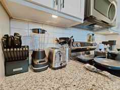 This contemporary apartment with an urban design is fully furnished and features a king-size bed, a sofa bed, a fully equipped kitchen with a Keurig coffee maker, a refrigerator, freezer, stove, oven, and microwave. Also included are a 4K HDTV, central AC and heating, and an in-unit washer and dryer.