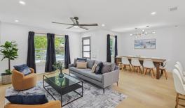 This home features a clean, modern design with an open-concept layout and comfortable furnishings. The fully equipped kitchen includes stainless-steel appliances, granite countertops, a kitchen island with stool seating for 3, and cooking essentials. The dining room seats up to 8 guests. The living room offers a couch, sofa, coffee table, rug, decor, and a cozy electric fireplace. The backyard offers a deck with a conversation set and patio furniture, as well as a fire pit with loungers.