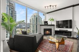 Experience the luxury of this stunning 931 sq ft 1-bedroom, 1-bathroom sub-penthouse with breathtaking views of False Creek, the mountains, and the city. This elegant home features an open-concept living and dining area with floor-to-ceiling windows, a cozy fireplace, and a modern kitchen equipped with stainless steel appliances and quartz countertops. The spacious den includes an office desk and chair, perfect for remote work, and the updated bathroom offers a soaker tub and rainforest showerhead. Enjoy the ambiance of 9-foot smoothed ceilings and exquisite engineered hardwood floors. Building amenities include a gym and secure parking.