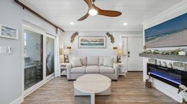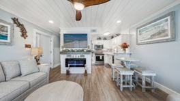 This apartment features a modern kitchen equipped with a coffee maker, cutlery, cookware, microwave, glassware, and silverware. For your convenience, a washer and dryer are provided. The living room offers balcony access, couches, side chairs, and a flat-screen TV. Enjoy access to the community pool and spa, shuffleboard, and beachfront picnic and grill areas.