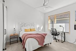 The living area offers a 120″ retractable projector screen paired with a powerful soundbar for an immersive movie night experience. Relax on the leather sectional, enjoy board games, and let natural light flood in through large windows. The smart TV and fast Wi-Fi (~69 Mbps) make it ideal for remote work or streaming. The chef-ready kitchen is fully equipped with a gas range, oven, microwave, wine fridge, dishwasher, and Keurig. A quartz island seats four for casual dining, while a formal table seats six. The kitchen is stocked with cookware, dishes, spices, and starter coffee. Two spacious queen suites come with plush linens, reading lamps, dedicated desks, and ample closet space. Ensuite bathrooms feature marble tile, plush towels, high-pressure showers, and boutique toiletries. A half bath on the main floor adds convenience. The private garage offers secure bike storage and a repair stand, perfect for mountain bikers. A washer/dryer is in the unit with detergent provided. The fenced patio includes Adirondack chairs, a gas grill, and a fire-pit table for evening relaxation.