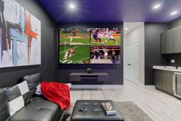 Enjoy the gorgeous kitchen, dining space, and living room on the ground level, featuring designer couches and a 65-inch smart TV. The vibrant basement includes a Mortal Kombat arcade machine, a foosball table, and another 65-inch smart TV. On the fourth floor, challenge someone to a game of darts. During warmer months, enjoy two outdoor rooftop patios with a barbecue grill, patio furniture, turf, and games.