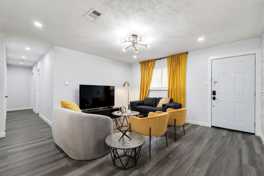 This single-level home features an open layout ideal for gatherings, a refreshing pool, and cozy interiors designed for relaxation. The fully equipped kitchen includes stainless steel appliances (oven, fridge, freezer, stove, and microwave), cooking essentials, place settings, dining utensils, granite countertops, and ample counter space. The living area offers comfortable sofas, a love seat, a couch, coffee tables, a media console, a flat-screen TV, high-speed Wi-Fi, a designer rug, and cozy accents. Additional amenities include chaise lounges, workstations, nightstands, bedside lamps, and decorative artwork. There is also a laundry room with a washer and dryer for your convenience.
