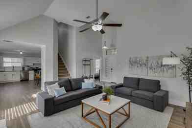 The home's sleeping arrangements include a primary bedroom with a king-size bed on the first floor, a second bedroom with two queen beds on the first floor, a third bedroom with a queen bed on the second floor, a fourth bedroom with two twin beds on the second floor, and a cinema room with a convertible queen sofa bed. The property features 2.5 bathrooms, including a full bathroom in the primary bedroom ensuite, a full bathroom on the second floor, and a half bathroom on the first floor. The open living area is a great spot for everyone to gather, featuring modern yet warm interior design. The spacious kitchen is beautifully updated with white cabinets, butcher block counters, and stainless-steel appliances, fully equipped for all your cooking needs. The stunningly decorated dining area is right next to the kitchen. The backyard is fully fenced-in for privacy, with a large patio space and a stunning pool perfect for cooling off.
