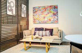 Welcome to a world where sophisticated design and thoughtful comfort converge. This studio has been professionally curated to provide a functional yet luxurious living experience. The heart of the studio is a plush sleeping area, featuring a luxurious bed dressed in premium linens. The space is adorned with chic, contemporary furnishings and designer accents, set against a neutral color palette that creates a serene and timeless ambiance. A large Smart TV is perfectly positioned for your entertainment. Find focus and productivity in the separate, dedicated workstation. This purpose-built corner includes a proper desk, a comfortable ergonomic chair, and a provided computer monitor, making remote work, video calls, or trip planning effortless. The sleek kitchenette is fully equipped for your culinary needs. It features premium, modern appliances, including a Nespresso machine, cooktop, and microwave. You'll find it stocked with essential cookware, utensils, and starter supplies to craft a simple breakfast or a light meal. Prepare for your day or unwind in the evening in the exquisitely designed bathroom. Featuring a spacious walk-in shower with designer tilework, this spa-like retreat comes complete with plush, luxury towels and complimentary high-end toiletries for a truly pampering experience. Your comfort is at your fingertips with the included Google Nest Hub. Use it as your central command center to play music, check the weather, or get answers to your questions, adding a layer of smart technology to your stay. Guests will have full and private access to the entire studio. Your stay includes complimentary high-speed Wi-Fi, all utilities, and access to the provided electric scooters. The property is located in a secured building, ensuring peace of mind.