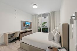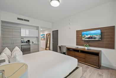 This 365 sq. ft. modern Ocean View unit with a Courtyard View is designed for your comfort. The plush king-size bed ensures a restful night's sleep, while the small kitchenette caters to your light meal prep needs. High-speed Wi-Fi makes it ideal for remote work, and the open layout maximizes space for a cozy stay.